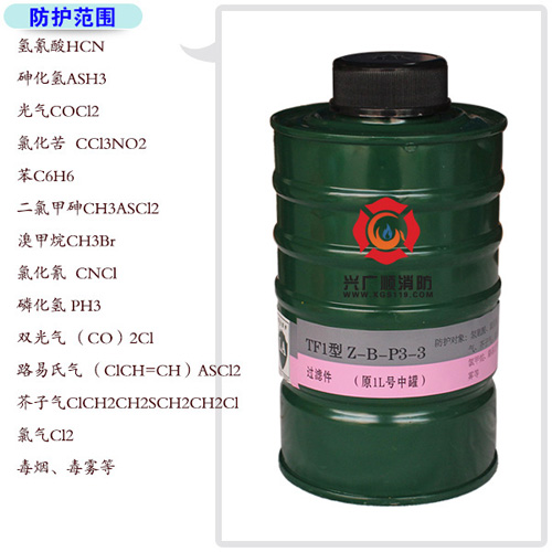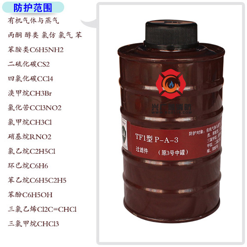 3號(hào)罐:防護(hù)對(duì)象:有機(jī)氣體與蒸氣:苯、氯氣、丙酮、醇類、苯胺類、二硫化碳、四氯化碳、三氯甲烷、溴甲烷、氯甲烷、硝基烷、氯化苦。